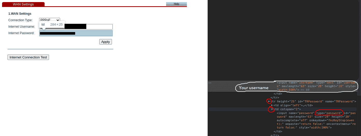 - Select your PPPoE username (for easy navigation and as you can not inspect element passwords), right click and click inspect element.